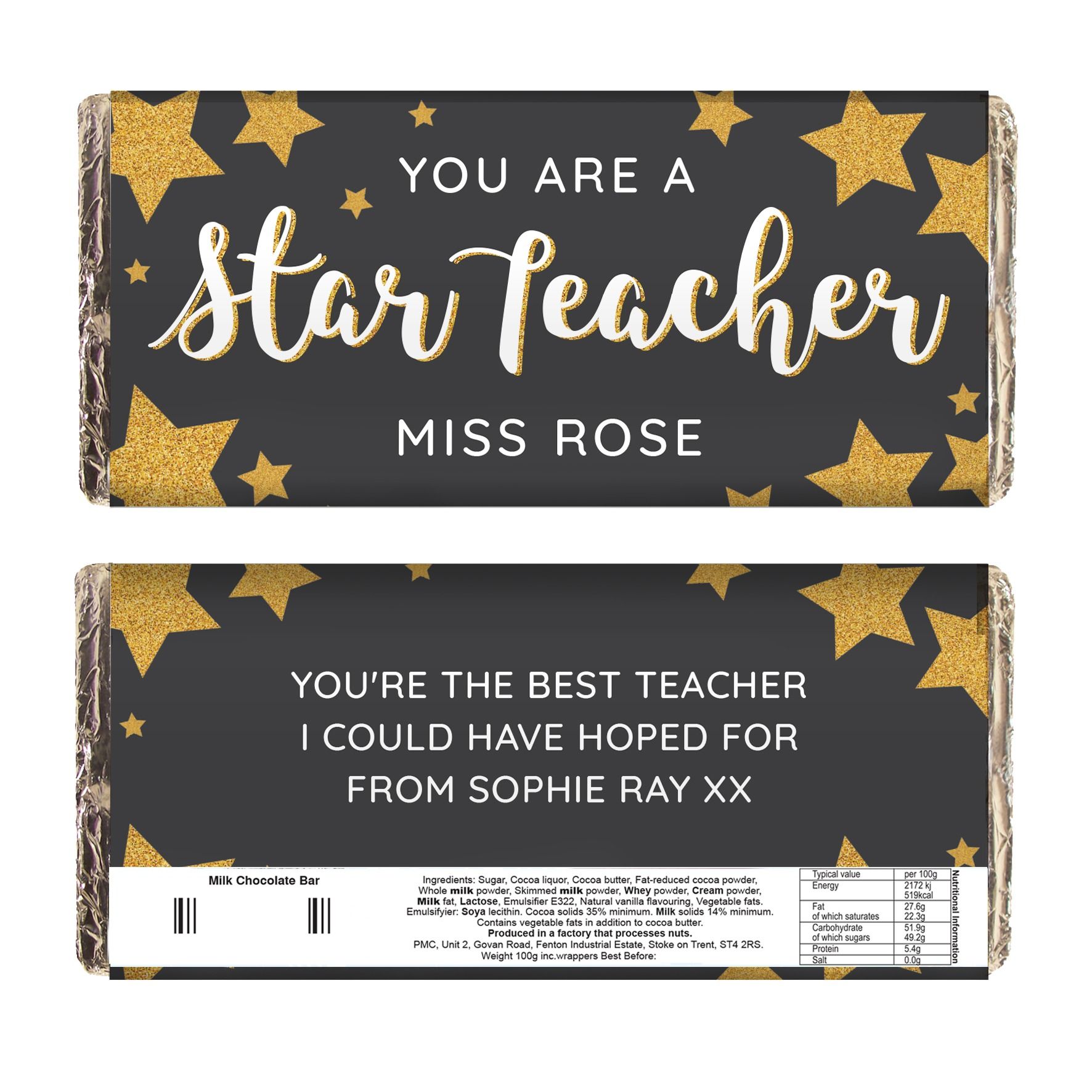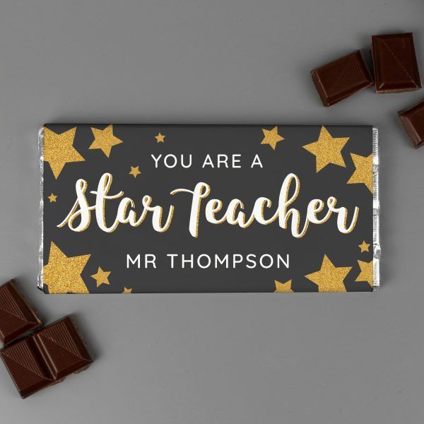 This chocolate bar is a sweet treat that is ideal for saying thank you to your school teacher! The chocolate bar can be personalised with a name on the front up to 15 characters and a message on the reverse of 3 lines with up to 25 characters per line. Please note “”You are a star teacher”” is fixed text and cannot be changed.The personalisation will appear in fixed upper case.Weight 100gMay contain traces of nutsOur great value chocolate includes free standard delivery.Ideal for Teachers.